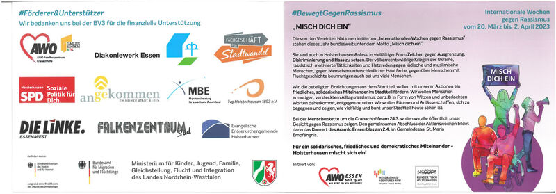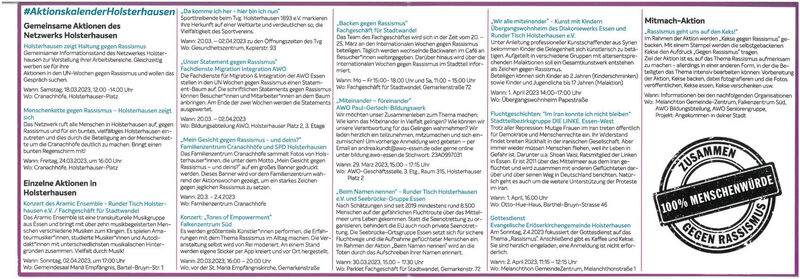Im Rahmen der „Internationalen Wochen gegen Rassismus“ bietet das Netzwerk Holsterhausen zwischen dem 20. März und dem 2. April im Stadtteil ein buntes Programm: Konzerte, Menschenkette, Workshop, Gottesdienst und mehr. Die Aktionen wurden in einer Kooperation der Integrationsagentur der AWO und des Runden Tisches Holsterhausen initiiert.